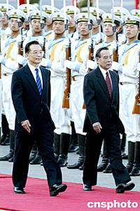 中国国务院总理温家宝五月二十日在北京欢迎越南总理潘文凯访华。中新社记者:郑萍萍