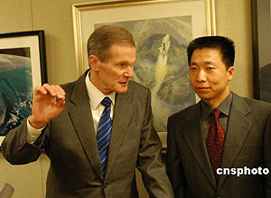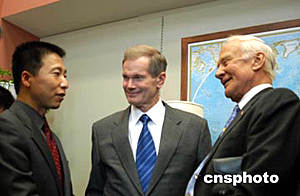 美国上世纪八十年代的航天员、现在的国会参议员比尔·纳尔逊在办公室与来访的中国首飞航天员杨利伟轻松交流,并带他参观自己收藏的航天图片。中新社记者:余东晖