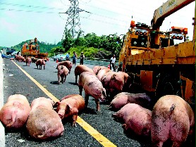 据台湾媒体报道,一大清早一辆载猪的货车在南二高嘉义路段突然爆胎翻覆,5、60只猪全被摔出来,有些猪受伤流血,有些吓得直撒尿,不过大部份的猪生龙活虎跑到马路上透气,捣乱了高速公路上的交通。附近民众看不下去,自动上来帮忙赶猪。
