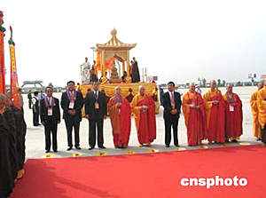 佛指舍利金塔被安放在机场升降平台机改装的花车上,僧侣仪仗队手持香花幢幡、吹奏法器作前导。在四名僧人的护卫下缓缓升空,送入包机。
