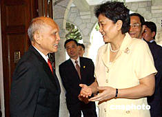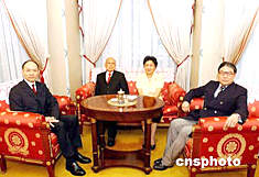 全国政协副主席、中共中央统战部部长刘延东25日抵达香港,并看望全国政协副主席霍英东。图为霍英东与儿子霍震霆(右)及霍震寰(左)与刘延东合照。作者:洪少葵