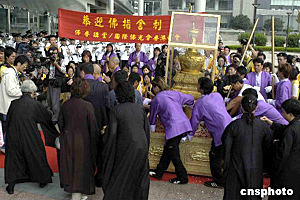今天下午一时三十分,载着佛指舍利和二十件国宝级文物的专机从咸阳机场飞抵香港国际机场。香港佛教联合会在机场停机坪举行了隆重的恭迎仪式,香港警察银乐队和佛乐团奏乐欢迎,香港民政事务局局长何志平到场迎接并主持献花仪式。随后,运送佛指舍利的莲花彩车,由警车一路护卫恭送往香港会议展览中心安奉。