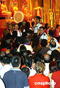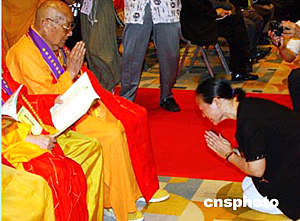 五月二十六日,在香港举行的香港佛教暨各界迎请佛指舍利瞻礼祈福大会上,一信众向出席开幕礼的本焕法师跪拜祈福。 作者:钱兴强