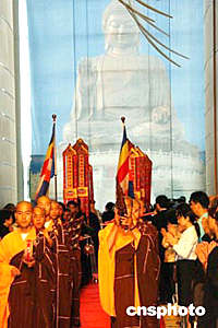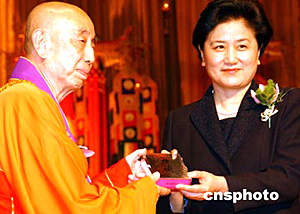 国家宗教局局长叶小文、中国佛教协会会长一诚法师,五月二十六日在香港会展中心举行的香港佛教暨各界迎请佛指舍利瞻礼祈福大会仪式上,向香港特首董建华赠送纪念品。 作者:钱兴强