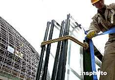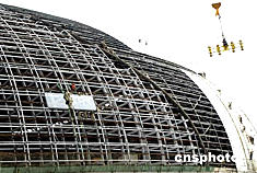 五月二十六日,位于北京人民大会堂西侧的国家大剧院开始安装壳体中央的曲线形玻璃幕墙,近6700平方米的幕墙将由1126块有色玻璃组成,建成后街上的行人透过玻璃幕墙便可看到金碧辉煌的休息大厅中新社记者:郑萍萍