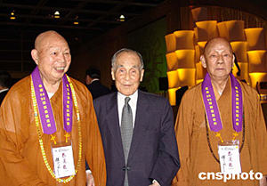 香港佛教文化产业董事长庄世平(中)与全国佛协会长一诚法师(左)、副会长根通法师(右)在慈善拍卖会上。中新社图
