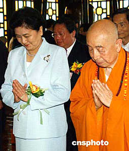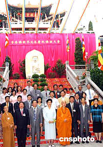 全国政协副主席、中共中央统战部部长刘延东,五月二十七日来到香港观宗寺参观,图为刘延东、国家宗教局局长叶小文、觉光法师、香港特区民政事务局局长何志平等一起在大雄宝殿前合影留念。作者:钱兴强