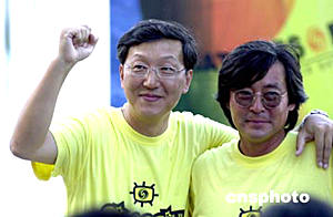 为纪念郑和下西洋六百周年,一艘命名为“凤凰号”的单桅帆船将由翁以煊、郑浩驾驶于七月十三日从当年郑和宝船开出的南京出发,展开历时八个月的航海电视行动。图为五月二十七,“凤凰号”船员在深圳大鹏湾浪骑游艇俱乐部与媒体记者见面。作者:陈文
