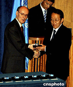 中新社联合国五月二十八日电 (记者 赵海燕)五月二十九日是联合国“国际维和人员日”。二十八日中午,联合国向二00三年在维和行动中牺牲的人员颁发哈马舍尔德勋章,其中包括去年五月在刚果(金)执行维和任务时牺牲的二十六岁的中国军人付清礼。