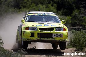 2004年全国汽车拉力锦标赛“海淀驾校杯”北京拉力赛经过2天激烈的较量5月30日在北京落下帷幕,由于凤凰岭恶劣的路况,参赛的68部赛车今天共有49部赛车参加比赛。N组冠军被咳速停拉力车队11号车(中)的英国外援大卫·辛吉斯/丹尼尔·巴里特获得,亚军是佳通轮胎车队(右)的刘曹东/周丽,咳速停拉力车队的刘斌/黄煜获得第三名。中新社记者:盛佳鹏