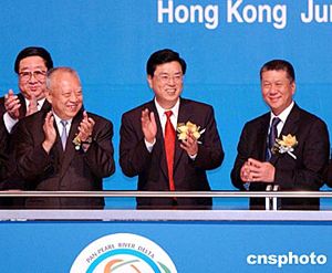 6月1日在香港揭幕的「泛珠三角区域合作与发展论坛」上,由特区行政长官董建华、广东省委书记张德江及澳门特首何厚铧主持亮灯仪式。作者:洪少葵
