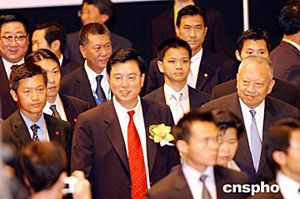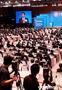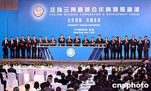 特区行政长官董建华陪同中共中央政治局委员、广东省委书记张德江等与会官员出席开幕式。作者:洪少葵  在香港会展中心进行的「泛珠三角区域合作与发展论坛」会场。作者:洪少葵