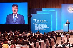 “泛珠三角区域合作与发展论坛”6月1日在香港揭幕,图为国家交通部部长张春贤在讨论上演讲。作者:洪少葵