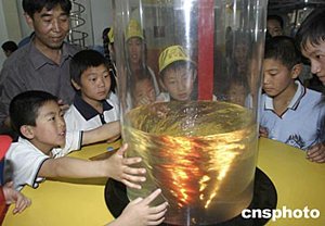六月一日,几名打工子弟在宋庆龄科技馆观看漩涡演示器。宋庆龄基金会专门拨款四十余万元为科技馆增添了一批科普活动器材,先后邀请一百多名打工子弟免费来此欢度“六一”。中新社记者:史利