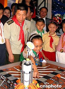 六月一日,一位小航天迷在北京中国儿童中心向航天飞行员杨利伟介绍机器人火星探险车。当天,杨利伟在孩子们的簇拥下出席了以“学习科学文化知识,发展祖国航天事业”为主题的儿童科技活动,与孩子们一起欢度“六一”。中新社记者:王欢