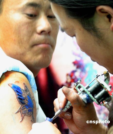 6月1日,南京湖南路一家美容店内,美容师为一名男士在胳膊上纹上一只“造价”500元的彩蝶。随着夏天临近,新潮的男士们也想在自己的身体上秀一把。DD 摄