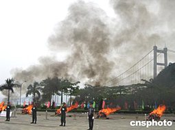 六月三日,广东有关部门在虎门现场销毁了一百六十五公斤毒品,以纪念民族英雄林则徐虎门硝烟一百六十五周年。广东虎门现在是全国禁毒教育基地。作者:杨伏山