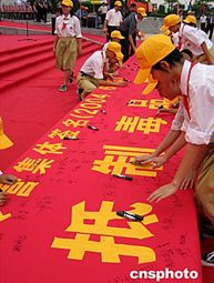 适逢民族英雄林则徐虎门硝烟一百六十五周年,福建省和广东省禁毒办联袂在虎门主办闽粤港澳台青少年禁毒夏令营活动。图为闽粤港澳台青少年学生集体签名,对毒品说“不”。作者:杨伏山