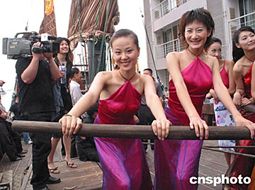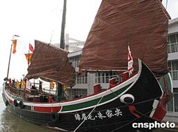 六月四日下午,电视纪录片《郑和下西洋》水路拍摄启航式在南京下关码头举行。摄制组将沿着郑和下西洋航线的重要地段进行水路拍摄,重现祖先航海的艰险,寻觅散轶海内外的历史遗存,诠释六百年来的谜点。图为“郑和宝船”的风帆徐徐升起。作者:丁东升