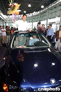 随着陕西西安“体育彩票造假案”全案告破,六月四日下午,陕西省西安市体彩中心负责人宣布刘亮于三月二十三日所获特等A奖彩票有效,并向其当面交付所中得的宝马轿车。同时,陕西省、西安市体育局负责人向刘亮公开道歉。图为刘亮喜获宝马车后的情形。作者:李宗文