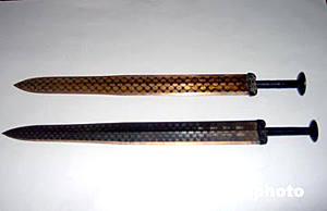 六月初,湖北省博物馆专家对所谓“高仿真”的越王勾践剑进行了技术鉴定,有关专家认为所谓“高仿真”剑与真品差异很大,并声明“高仿真”行为不合法,应立即停止。近日,湖北荆州有人声称“破解”了越王勾践剑千年不锈之谜,准备建立生产基地批量生产“高仿真”剑。图为越王勾践剑(下)与“高仿真”剑(上)的对比。作者:艾启平
