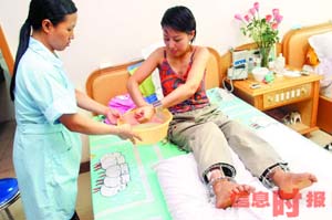 管小姐手拿着一把扳手,一丝不苟地拧着套在脚上的螺丝,极像一个修理机器的工人。拧完螺丝之后,又在医生护士的扶助下,握着脚手架在房间里来回移动。据管小姐介绍,手术的第二天,她就把身上的镇痛棒拆除了。但是脚部仍然无法动弹,几天来一直只能躺在病床上,脚部总感到胀痛,尤其是晚上翻身时,膝部总感到一股钻心的疼痛。现在每天要打一次消炎针和喝一碗骨头汤。“很多人都想知道她手术后想找一个什么样的男友,而我从来就没有想过,如果对一个打工仔有感觉,也会嫁给他。”管小姐坦言道。