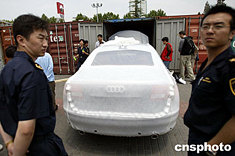 六月六日,参加二零零四年北京国际汽车展览会的车辆陆续运抵北京国际展览中心。海关人员开始对参展汽车进行逐一检查。图为参展车辆奥迪A8等待海关人员检查。中新社记者:盛佳鹏