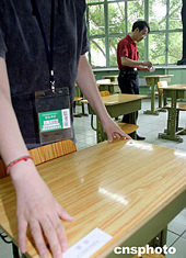 六月六日上午,北京四中考场的监考员正在考场认真地核对考生姓名及编号。一年一度的中国全国统一高考将于六月七日开始,今年全国普通高校招生报名人数总计七百二十三万,较去年净增一百一十万名,是历年来高考报名人数最多的一年。中新社记者:张勤
