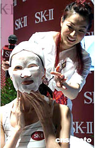 六月七日,百变天后郑秀文在上海出任SK-II新美白天后,并在活动现场指导一名年轻女孩使用面膜的正确方式。中新社记者:廖文静