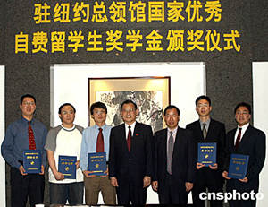 “国家优秀自费留学生奖学金”评选工作去年开始在美国、日本、英国、法国和德国五个国家试点,首届共有九十五人获奖,美国三十人,其中纽约总领馆领区的美国东北部十个州共有六人获奖,分别是:哈佛大学政治学专业的阎小骏、麻省理工学院从事媒体实验室的潘鹏凯、康乃尔大学电子工程专业的吴华强、纽约大学理论化学专业的张大为、新泽西理工学院通信与信号处理专业的何磊、俄亥俄州立大学化学物理专业的刘进军。