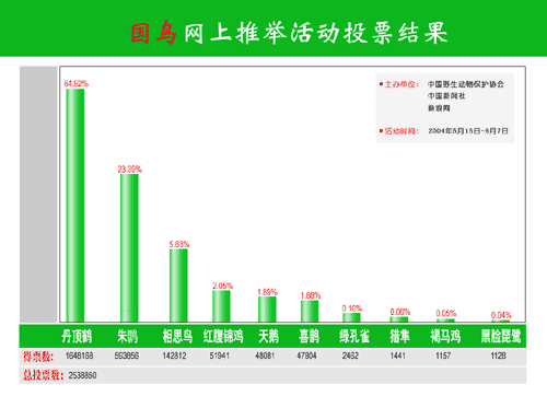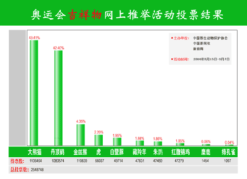 这项由中国野生动物保护协会、中国新闻社、新浪网联合全国二十多家新闻网站举办的活动,在规模、规格、权威与影响上创造了此类推举活动的全国之最。主办单位今天介绍,在严格身份认证的情况下,二十多天的推举活动期间,全国三十个省市自治区以及东南亚华侨、华人在内的五百万网民参与了投票。引人注目的中国传统文化鸟丹顶鹤集中了网民近六成的投票,即便是在吉祥物推举中,也仅以微弱差距屈居第二。