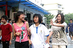 六月八日,全国统一高考结束,北京莘莘学子们步出考场高兴地和焦急等待着的家长打招呼。中新社记者:张勤