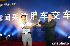 六月八日晚,一汽集团在北京国际会议中心举行新闻记者见面会,一汽老总竺延风等在见面会上解答了众多记者的提问,会后举行新闻采访用车的交车仪式,第一汽车集团公司副总经理安德武向媒体代表颁发“车钥匙”。中新社记者:盛佳鹏