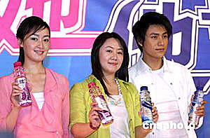 六月九日,中国内地当红小生陈坤(右)和中央电视台主持人赵琳(左)在北京为某饮料担任形象代言人。作者:高远