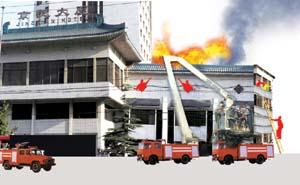 消防车驶进大厦的院子后,迅速搭起云梯,数名消防人员从云梯进入大厦,随后,一辆升起坐臂的消防车开始陆续将被困者接下大厦。