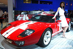 六月中旬,在北京中国国际展览中心举行的“2004北京国际车展”上,福特GT跑车亮相展会,让观众眼前一亮。中新社记者:武仲林