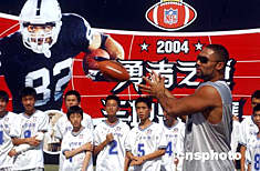 六月十一日,来自美国国家橄榄球大联盟的明星球员Teyo Johnson在北京对此间参加首届美式腰旗橄榄球总决赛的中国小运动员进行技术指导。美式腰旗橄榄球是源于美国国家橄榄球大联盟(NFL)的一项大众化运动,旨在将美式橄榄球的基础规则和技巧介绍给全世界八至十四岁的青少年。目前,这项运动在世界三十多个国家的青少年中广为流行。中新社记者:武仲林