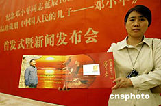 为纪念邓小平诞辰一百周年,邮品珍藏册《中国人民的儿子——邓小平》6月16日在北京人民大会堂举行首发式。珍藏册内包括国家邮政局为纪念邓小平百年诞辰特批的104枚个性化邮品,这些邮品集纳了邓小平一生中各个历史时期的珍贵照片,并配有2克999纯金、20克纯银制作的纪念张一枚。这套珍藏册全球限量发行3万套。中新社记者:盛佳鹏