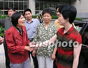 十六日中午,江西广丰县政府一行六人专程赴济慰问正在山东省立医院接受救治的在阿受伤工人及他们的家属。图为广丰县副县长祝美清(右一)与受伤工人蒋昌泉的亲家属交谈。作者:胡洪林