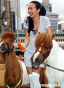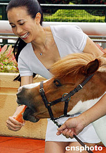 香港赛马会六月十七日在跑马地马场举行“2003/2004香港赛马会冠军人马颁奖典礼”打气活动,歌星莫文蔚兴致勃勃向可爱的雪特兰小马喂食红萝。中新社记者:钱兴强