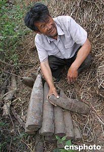 这些炮弹已经被挖出二十余年。据五十八岁的贾衍教老人介绍,大约二十多年前,有一天在翻地的时候,他突然感觉碰到了一个硬东西,仔细一看竟然是炮弹。起初老人并没当回事,继续翻,没想到越挖越多,总共发现了十七枚,后来就把炮弹带回了家。