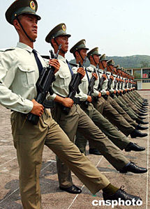 为庆祝香港回归七周年,中国人民解放军驻港部队决定在七月一日开放赤柱、昂船洲和石岗军营给香港广大市民参观,图为驻港部队士兵严格训练。中新社记者:钱兴强