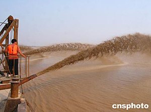 六月二十二日,黄河人造洪峰抵达河南省濮阳市范县境内,当地出动扰沙船,对该水域进行人工扰沙。据悉,“人工扰动”就是利用高压水泵抽取黄河水并转化成高压水流,以每秒数十米的速度冲击河床,起到扰动和扬沙冲淤的作用。作者:慎重