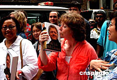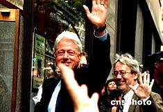 图为克林顿中午走进曼哈顿中城的巴恩斯·诺布尔书店参加三个多小时的签名活动。