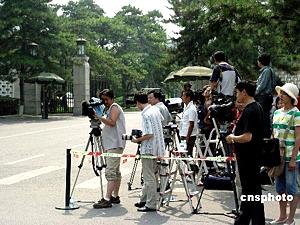 在成群的记者队伍旁边,还另有一道风景线。比起略显紧张的记者群,一旁的这群人则显得相对安逸。其中,一位六十三岁的老者告诉记者,他住在附近,第一次六方会谈他就过来看了,这次也过来“关心一下国家大事”。一旁还有两位学生模样的人,询问后得知,一个是清华大学的学生,一个是北京交通大学的学生,适逢考试结束,这两位高中时代的同学今天结伴,到这里“开开眼界”。