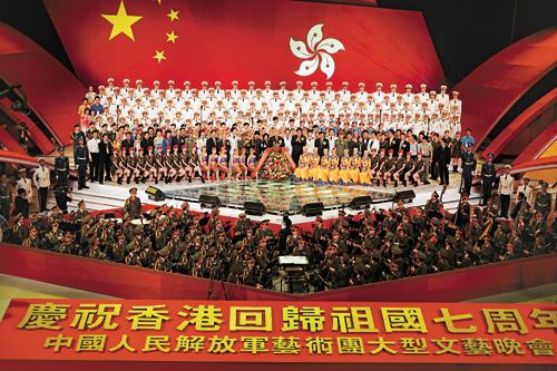 中新网6月24日电 据香港大公报报道,中国人民解放军艺术团昨晚在香港红磡体育馆举行“庆祝香港回归七周年大型文艺晚会”首场演出。特区行政长官董建华、中央驻港联络办主任高祀仁,副主任李刚,外交部驻港特派员杨文昌、解放军驻港部队司令员王继堂、政委王玉发,特区律政司司长梁爱诗等出席观看了晚会。
