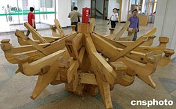 由北京奥组委主办的第二届“北京2008奥林匹克文化节”系列活动之“天韵”人文奥运艺术作品邀请展在中国人民大学开展,图为摆放在学校图书馆大厅的参展作品“朵”。中新社记者:廖文静
