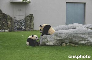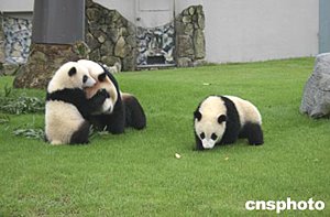 六月下旬,世界第一对由母体同时抚育长大的大熊猫“隆浜”和“秋浜”与母亲“梅梅”在日本和歌山白浜野生动物园草坪上玩耍。这对双胞胎二零零三年九月八日出生在日本,“隆浜”现在体重已达十七点九公斤,“秋浜”达十九点三五公斤,体态娇憨,十分惹人喜爱。一般说来,熊猫产下双胞胎,由于顾此失彼,很难由母体成功地抚育。作者:肖龙联