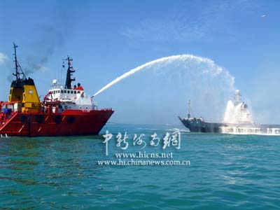 此时,观摩演习的人们发现,在出事船只周围,已经有多条各类救助船开始行动,中国救助船“南鹰”轮和“南海救一六八”轮一左一右向燃烧着的遇难船只进行压制性灭火。两只泡沫枪和一只高压水枪对准海难船强制灭火。此时的场面蔚为壮观,一只高压水枪激起的水雾在热带阳光的照耀下出现了一道漂亮的彩虹。