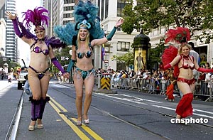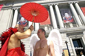 六月二十七日,美国旧金山市举行第三十四届同性恋游行。图为一对打扮“香艳”的男子参加游行。 作者:陈钢